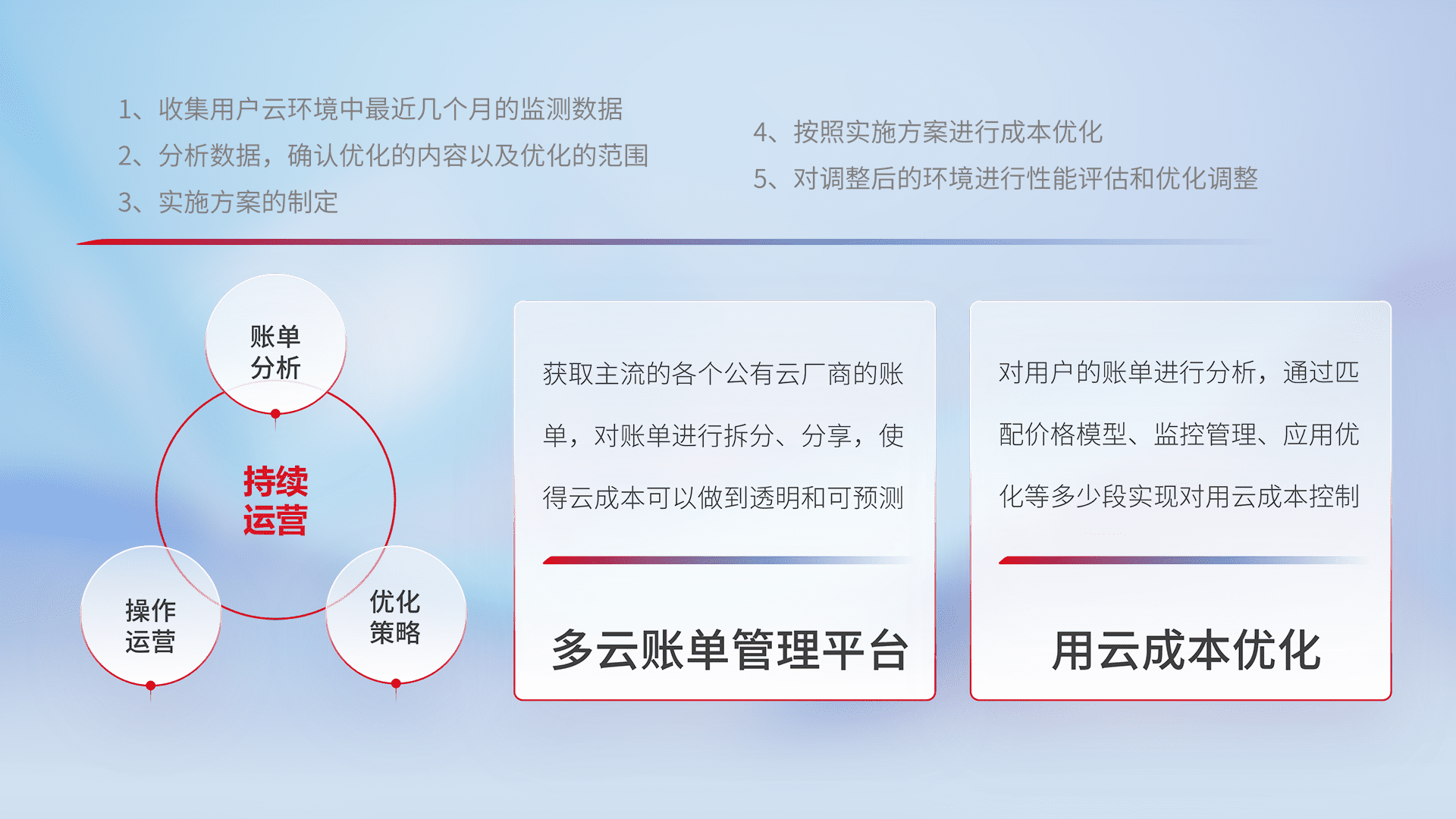 通过多云纳管,,,以统一的资源数据模型把客户的云资源进行抽象和封装,,,进而实现对多云资源的统一操作,,,,保障云资源管理的可靠性、、、、稳定性与可用性。。。。量身定制化运维内容,,配置、、、开发运维、、、补丁管理、、备份、、、、监控、、、认证和访问管理、、、审计和日常巡检等,,保障在用云过程中的可靠度,,,稳定度以及高可用率。。。